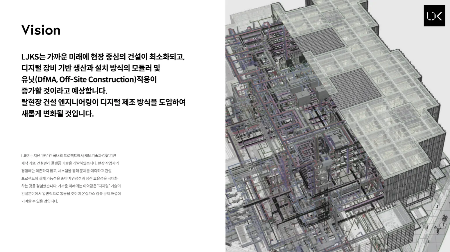 LJKSλ κ°κΉμ΄ λ―Έλμ νμ₯ μ€μ¬μ 건μ€μ΄ μ΅μνλκ³ , λμ§νΈ μ₯λΉ κΈ°λ° μμ°κ³Ό μ€μΉ λ°©μμ λͺ¨λλ¬ λ° μ λ(: DfMA, Off-Site Construction) μ μ©μ΄ μ¦κ°ν κ²μ΄λΌκ³ μκ°ν©λλ€. ννμ₯ κ±΄μ€ μμ§λμ΄λ§μ΄ λμ§νΈ μ μ‘° λ°©μμ λμ